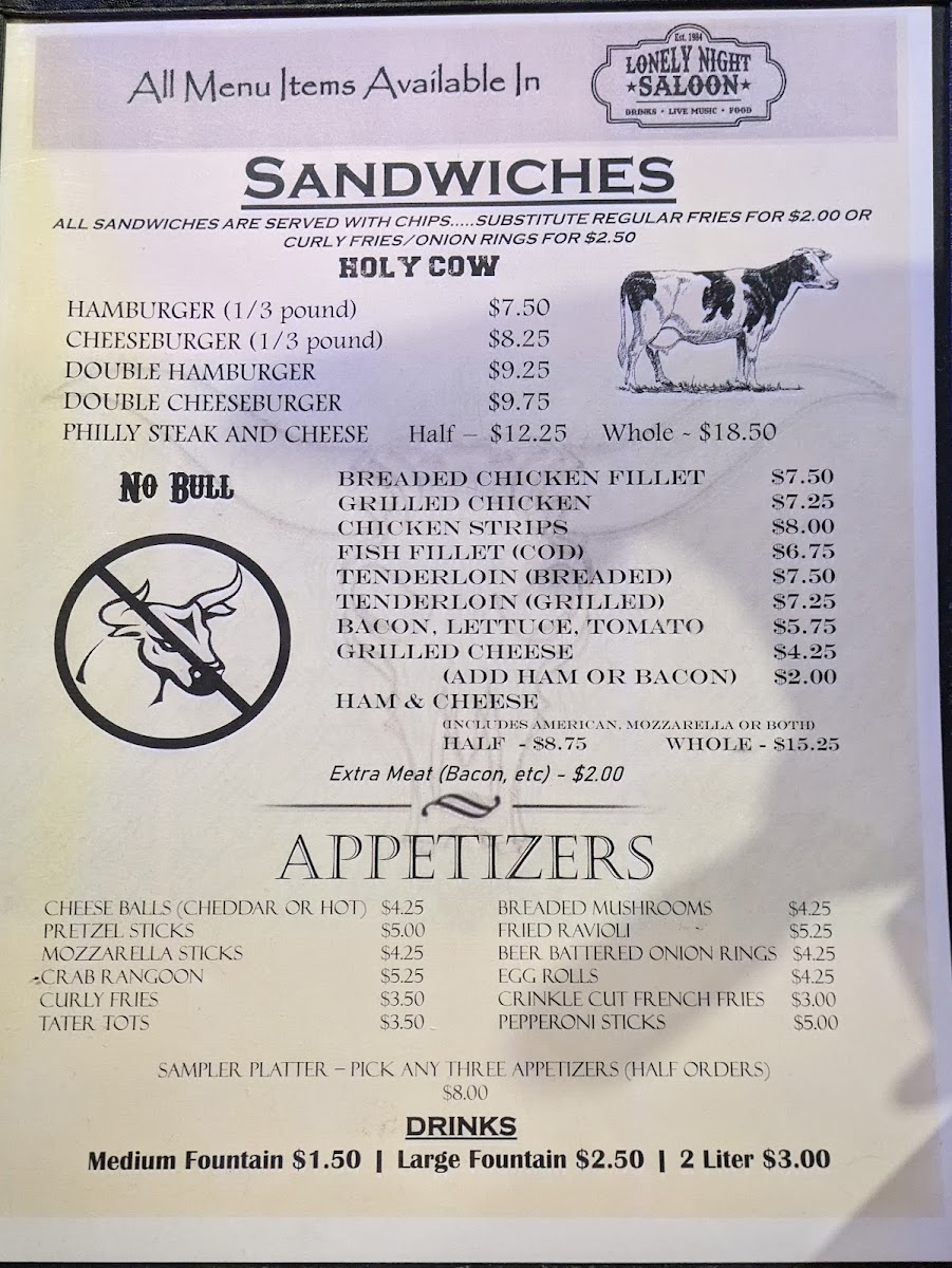 The menu at Lonely Night Saloon offers a straightforward selection of bar and grill classics, crafted to pair well with relaxed evenings and casual gatherings. You'll find satisfying favorites like pepperoni pizza, grilled chicken sandwiches with fried mushrooms, and classic cheeseburgers served alongside crispy French fries. These dishes provide familiar comfort, perfect for unwinding after a long day or enjoying time with friends over a game or live music.
